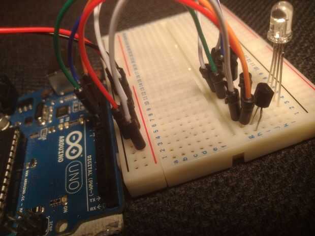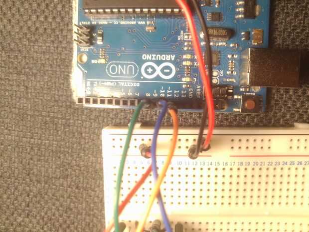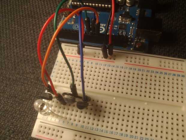 Ahora usted necesita conectar la clavija media del transistor en los pernos deseados y comprobar que la pierna es para que el color en el LED. En la mía es anodo azul, rojo, verde de izquierda a derecha si tienes el pin más largo hacia la derecha (mirar la imagen) En este ejemplo estoy usando pin 9 para el verde, 10 para el azul y 11 para el rojo por lo que he conectado el transistor correspondiente a la derecha condujo patillas y arduino.