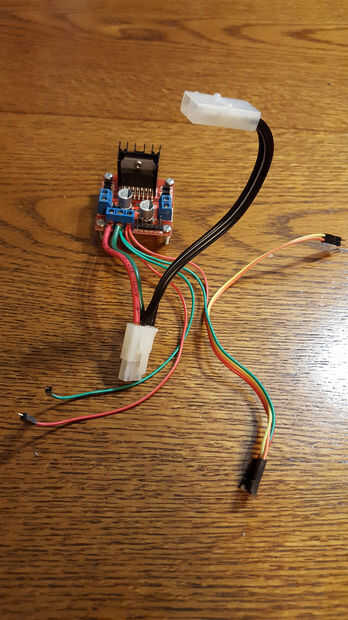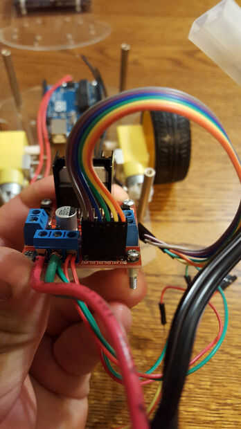 Empezar por construir el arnés que suministrará energía a y desde el controlador del motor. Ten en cuenta eso si el tablero suministrado con + 7-35v en la terminal de 12 voltios y el puente de 5v se deja en su lugar, la Junta es la salida de + 5v a la terminal de 5v, por lo que no hay que apagar el regulador del motor de la + pin de 5v de Arduino. Otra cosa a recordar es que todos los motivos deben ser atados para que la lógica de operar como era de esperar.