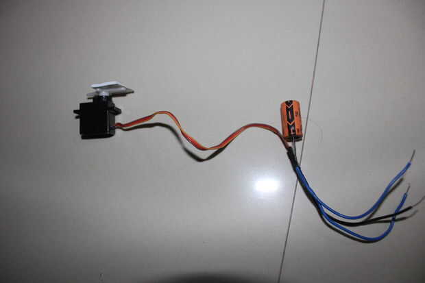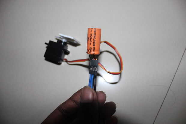 Rellena los cables del condensador en el puerto de servo y con cinta para asegurarse de permanecería allí (no soldador hace un recurso a tales métodos bárbaros: P)
