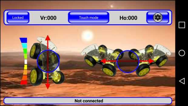 https://Play.Google.com/store/apps/details?id=com... La aplicación le permite manejar lo rover con el joystick de cuatro terminales en modo retrato o con 2 joystick (multitouch) en modo apaisado.