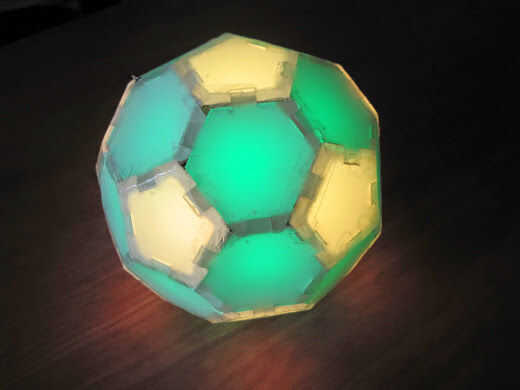 Cada lado es enlighted individualmente con un LED inteligente (WS2812b, en un protoboard pequeño) detrás. Un microcontrolador (MSP430G2553, PDIP.) puede utilizar un giroscopio/acelerómetro (MPU6050, módulo de GY-521) para cambiar los colores, que puede sí mismo ser controlado via bluetooth (HC-06). También hay espacio para un módulo de brújula (HMC5883L, módulo de GY-271).