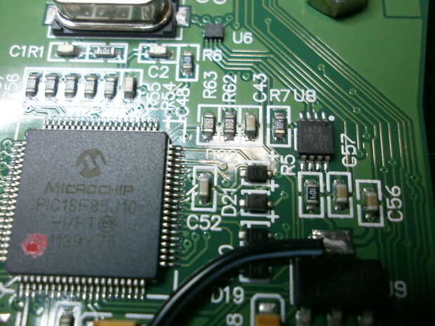 Empezar por raspado de la máscara de la soldadura en el rastro (bajo etiqueta D22 en la fotografía), a continuación, cortar el rastro para que el RX1 en lo PIC y R1OUT en la SP3232 es aislada. Cortar con cuidado para que no dañar cualquier otro rastro cercano, sugiero hacerlo bajo una lupa bien iluminada para que usted puede ver claramente lo que estás haciendo.
