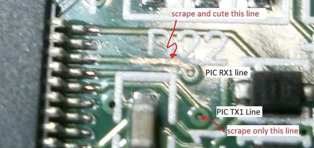 No podemos conectar directamente a la RX1 (pin38) en la viruta PIC. Hacerlo sería corta pernos de salida SP3232 y bluetooth y uno de o ambos ellos podrían dañarse. La mejor solución para esto es cortar el rastro de PCB.