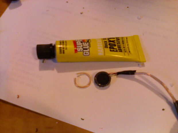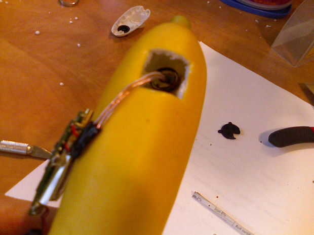 Utilice pegamento de epoxy para fijar el altavoz del auricular para el interior de la pared del plátano frente a los agujeros perforados previamente.