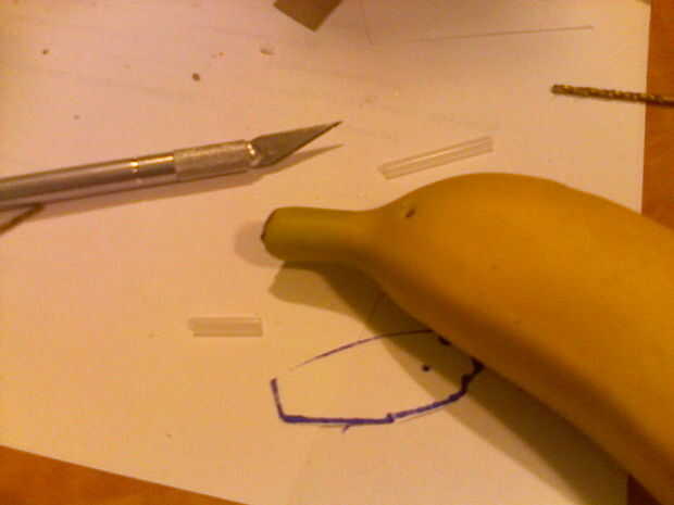Utilizando la plantilla de papel de la placa de circuito impreso, trate de averiguar donde el interruptor y LED están por debajo de la piel del plátano. Utilice su cuchillo y broca para hacer agujeros sobre el interruptor. Corte el tubo a la longitud necesaria y en el orificio.