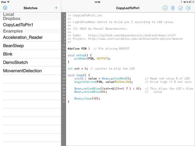 Queremos que el grano para conducir lo MOSFET según el estado del LED RGB. El bosquejo (mostrado arriba) hace el truco y al mismo tiempo, emite blips azul, para indicar que se está ejecutando.