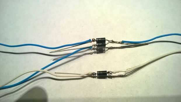 Usando los diodos 1N4001 podemos conectar el Bluetooth a los altavoces L y R. Los diodos solo permiten un flujo de corriente hacia delante pero no permite corriente fluya hacia atrás. Ponemos estos diodos sobre la L y la R desde el tablero del transmisor FM. Corte una pequeña ranura para que puedas ver los cables expuestos y conectar cables de extendido tiempo suficiente para llegar a su Bluetooth. Los empalmes de la soldadura o se puede utilizar cinta aislante para que no se desintegraría (hice dos).
