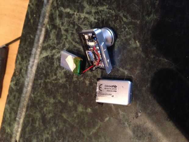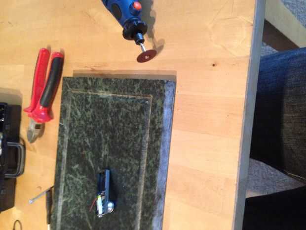 Utilizando un Dremel o herramienta equivalente, cortar en la mitad de la caja; dejando sólo el lado que tiene los componentes alojados dentro de ella. Tenga cuidado de no cortar el cable que conecta la batería.