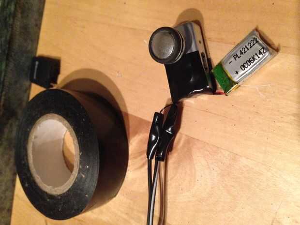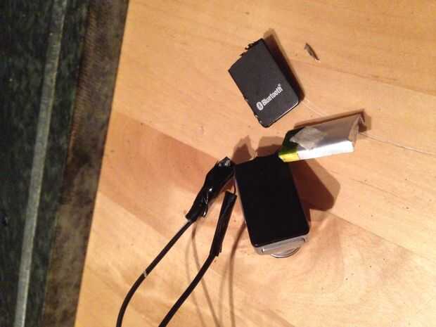 Ahora se quedan con lo que es la mitad un auricular Bluetooth con la batería colgando fuera de la cara y dos cables que sobresalen fuera de la cinta aislante.