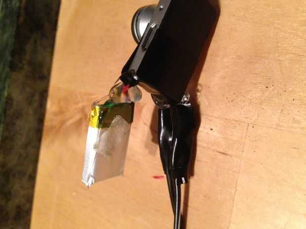 Ahora tenemos que poner detrás junto otra vez; usando la mitad de la placa que corte por la mitad anterior; clip de este back en el auricular y con cinta aislante, asegúrelo en su lugar.