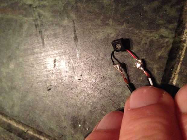 Ahora, utilizando el micrófono diminuto que usted enganchado de anteriormente; Solver el largo los cables de los audífonos en los dos cables que cuelgan del micrófono. Por favor asegúrese que usted sabe que es el cable positivo de modo que puede asegurarse que la soldadura los cables correctos.