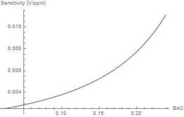 Utilizamos un divisor de voltaje para calcular el BAC por monitoreo del cambio en el voltaje en la resistencia de carga y utilizando la función de transferencia para calcular la resistencia cambiante del transductor. Disminución de la resistencia del transductor, aumentando el voltaje en la resistencia de carga. El diagrama de bloques muestra que el tema golpes en el transductor que se incorpora en el divisor de tensión. El divisor de tensión se conecta a un convertidor analógico a digital antes de producir el salida BAC.