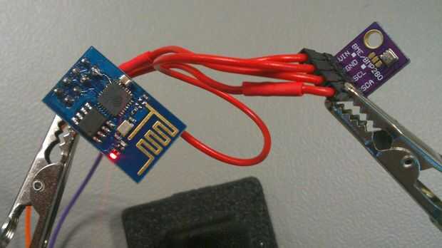El sensor está conectado directamente a la ESP8266 sin otro MCU en medio, a través de I2C. Datos se envían a una cuenta de ThingSpeak con qué propósitos.