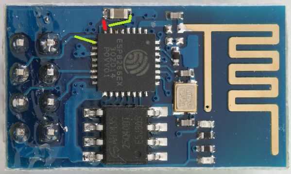 Para el I2C necesitaba GPIO2 SDA y GPIO14 para SCL. El primero de ellos ya estaba disponible, pero el segundo requiere alguna modificación que hacer. Como generalmente no activamente utilizo el pin CH_PD, decidí modificar el PCB con el fin de la ruta GPIO14 (pin 9) a lo que solía ser el pin de la CH_PD del tablero y cableado pin 7 (que fue conectado previamente al CH_PD) del SoC a Vcc. En la siguiente foto me has marcado con rojo el lugar donde rascó el rastro de PCB y con verde las nuevas conexiones que hice (con hilo de 0,1 mm).