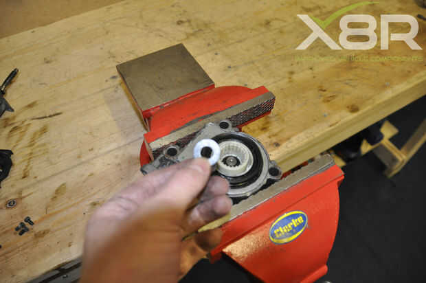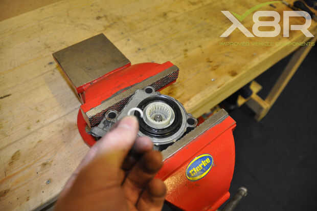 Retire el clip de retención C, esto se puede hacer con una combinación de conductores del tornillo. El método más fácil que hemos encontrado es utilizar alicates de anillo de seguridad para abrir el C luego insertar un pequeño destornillador plano en el espacio creado en la parte superior de la C para el retiro.