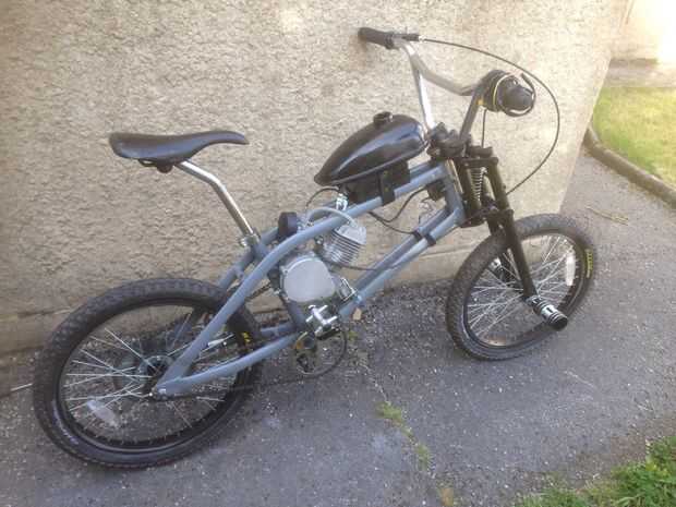 esto es muy sencillo de hacer me un kit motor de bicicleta 50cc (puede ser comprado apagado e bay) y un triciclo de deriva y sólo lo montado en la parte frontal de las horquillascomienzo con algunas horquillas de cualquier bicicleta cortar a medida h