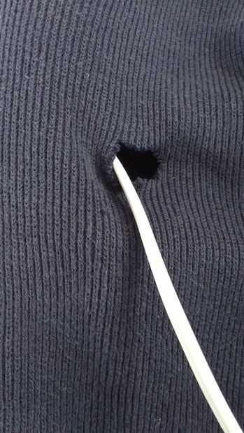 - Inserte el cabezal en el brazo de su elección dentro de la camisa (yo escogí el brazo izquierdo porque Bob estará sentado en mi sofá con su brazo izquierdo hacia arriba en el reposabrazos, ya que es cerca de la salida más cercana para conectar a). Encontrar donde el cable se salga la camiseta (enchufe) y corte un orificio aquí (lo suficientemente grande para caber el enchufe de la pared a través). Quite el cabezal del ventilador y apartar.