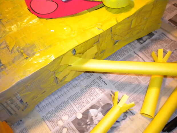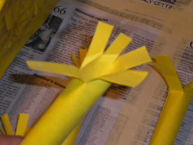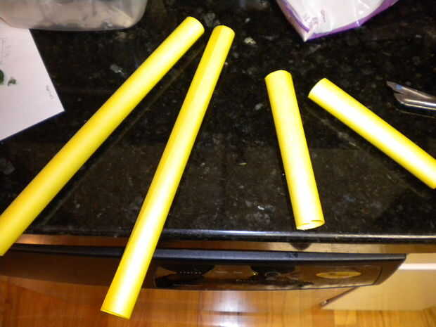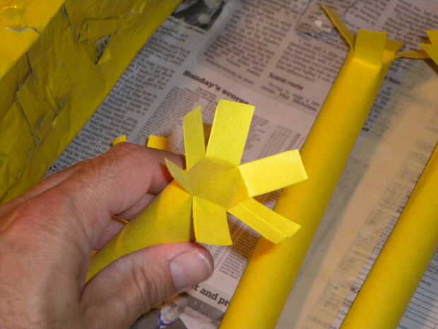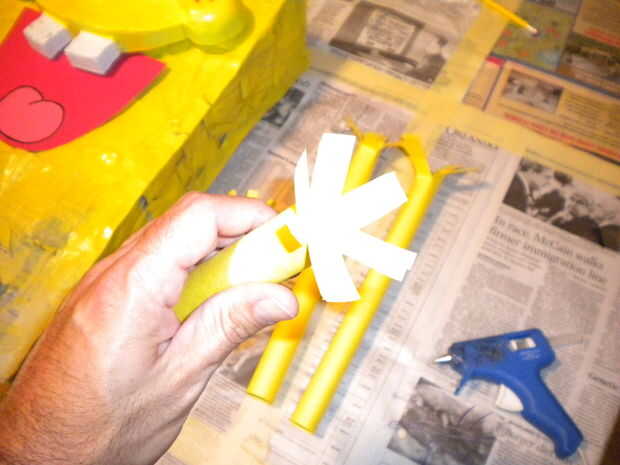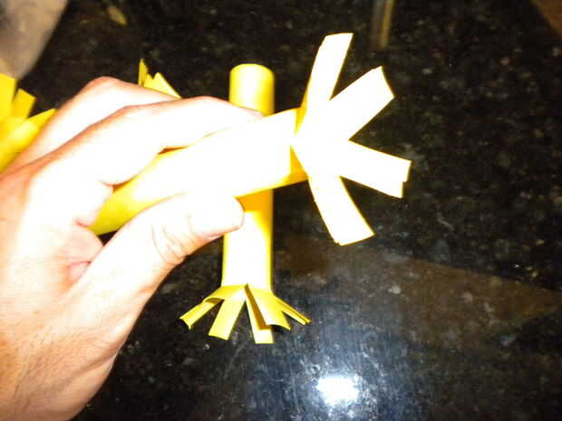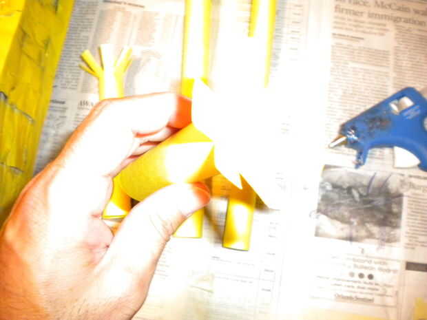 Hacer los tubos, rociando algún adhesivo en aerosol, o pegar y mantener en su lugar con clips. Luego corte a lo largo de la longitud de los tubos y flare estas fuera para hacer las bridas para sujetar el cuerpo. Para hacer los brazos angulares, flare en un ángulo como se muestra.