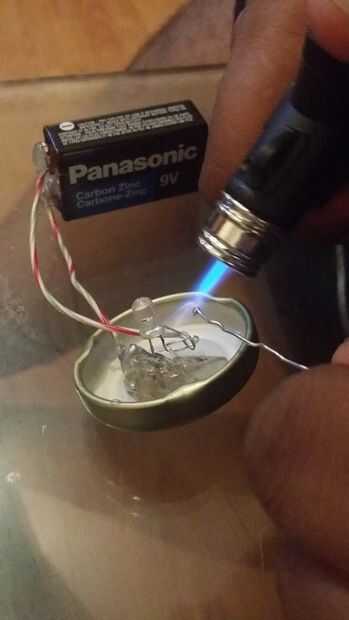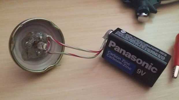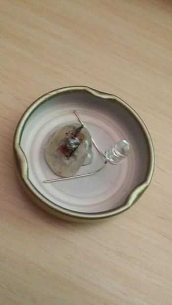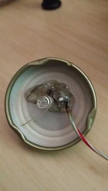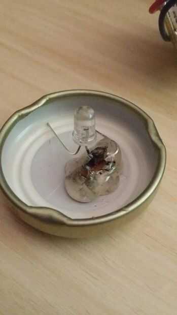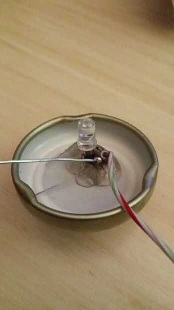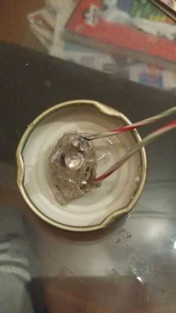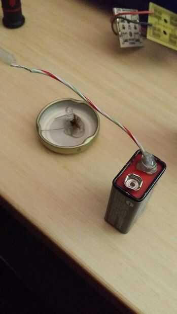 Cada pata del LED en el interruptor de la soldadura, jugar con las clavijas en el interruptor si no sabes que conectarlo para probar todo el circuito si puedes antes de comenzar a soldar. Poner pegamento sobre ella para que no se corta hacia fuera o se desconecta. En lugar de usar un clip de la batería, que lamentablemente no tienen en el momento, sólo algunos cables pelados y pegados a la pila de 9v. Estoy usando una vieja batería de 9v que salidas de 4v, así que es seguro para el LED. Sin embargo se puede utilizar un par de pilas moneda que será mucho mejor al final, le ahorra problemas de montaje. Después de pegar dos cables a cada cable de la batería, prueba del circuito antes de soldar para asegurar que funciona. Uno debe ir a la pata del LED unsoldered y el otro debe ir en el otro pin del interruptor. Si el LED no se enciende, sólo tiene que cambiar los dos cables de la batería. Si aún no enciende, verifique todas las conexiones para ver si alguno alrededor de tocar o no está correctamente conectado. Terminar aplicando una cantidad generosa de pegamento sobre las conexiones para asegurarse de que no un cortocircuito o soltarse.