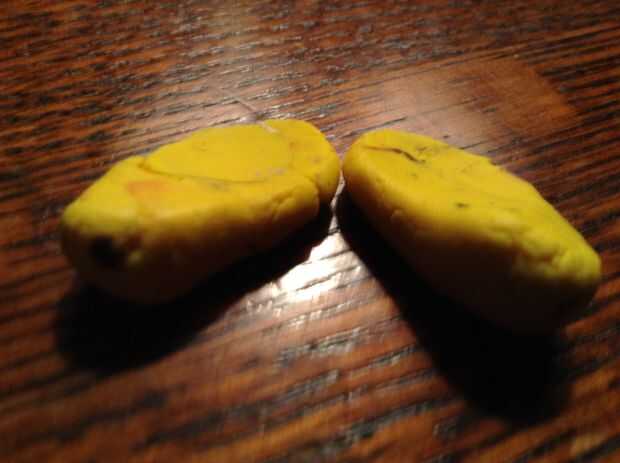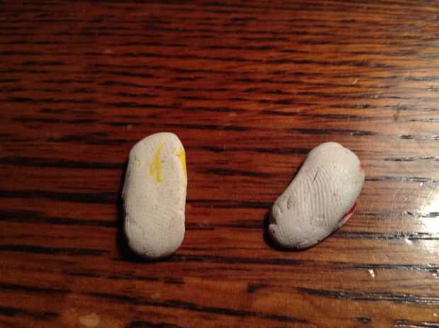 Los ojos y los pies cómodamente. Para hacer estas formas y ponerlos use arcilla blanca y amarilla. Usé barro sucio, mezclado para darle un aspecto antiguo.