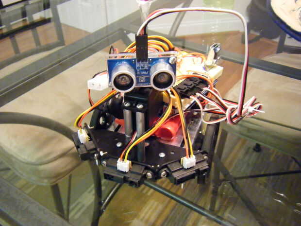 Bob ahora usa un regulador de conmutación y una 9.6V batería del RC para la energía, mejor sensor monta, un sensor de GP2D12 IR extra, un barrido servo para el telémetro ultrasónico y un microcontrolador AVR ATmega168 en una placa de desarrollo Arduino.