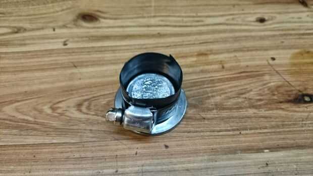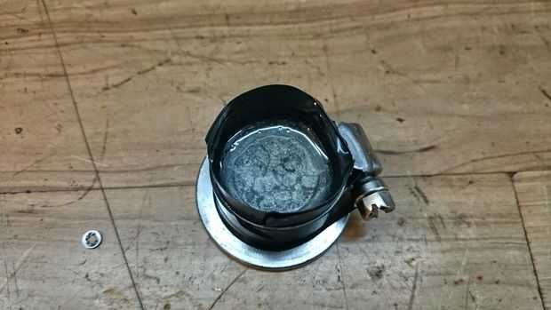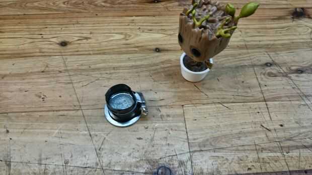 La base de la maceta era apenas un poco más grande y luego la parte superior de la parte superior de la nueva base. (Esto funcionó pero probablemente hay una mejor manera) Así que cogí una abrazadera de manguera de 1" y fue perfecto. Forrado el interior y hacia fuera lateral con cinta aislante para que el epoxi no funcionaría hacia fuera.