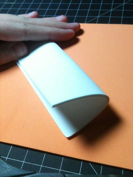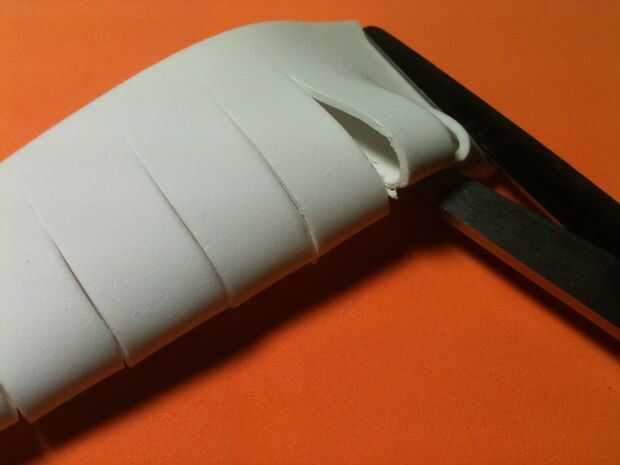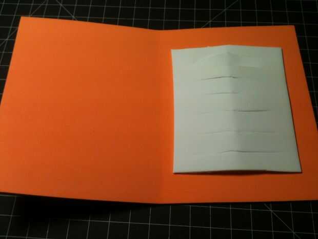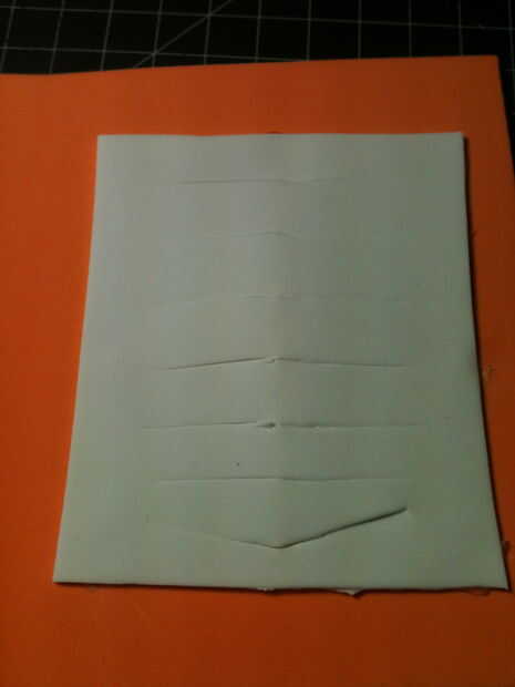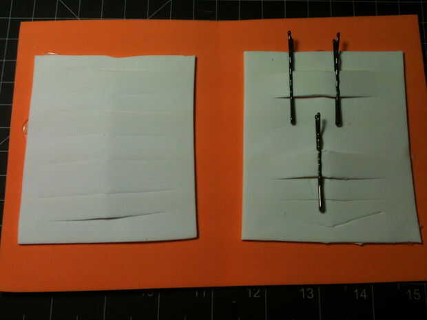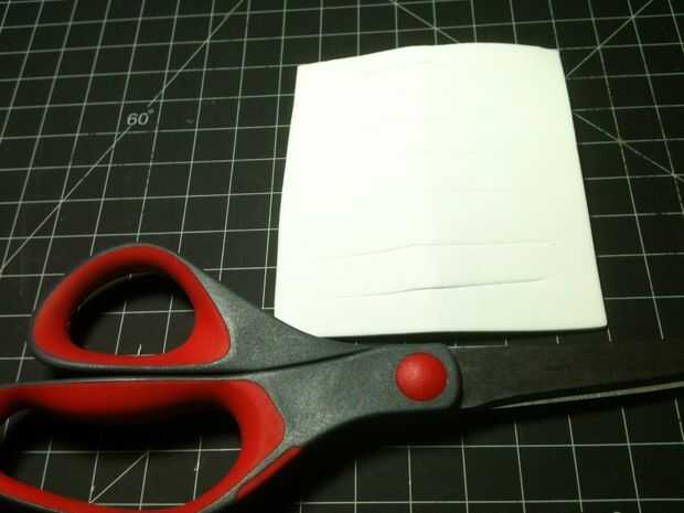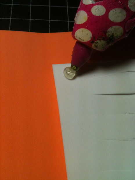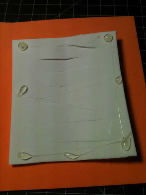 Ahora calienta la pistola de pegamento caliente. El chorro de un punto de pegamento en cada esquina de un rectángulo pequeño y en medio de los lados más largos. Pegar en el centro de una de las mitades de la hoja de la espuma. Repita con el segundo rectángulo, pegar sobre la otra mitad de la hoja de la espuma.