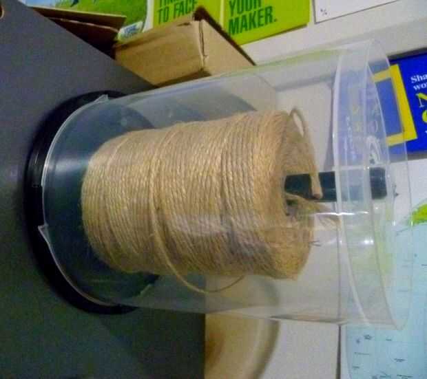 Para el rollo de guita, utilicé un carrete (muy) grande y mantiene la tapa luego para guardarlo de desentrañar demasiado.