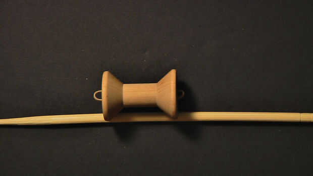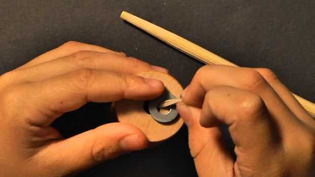 La banda de goma por el agujero de la bobina del hilo de rosca. En un extremo de la bobina, pase la banda elástica a través de la arandela.