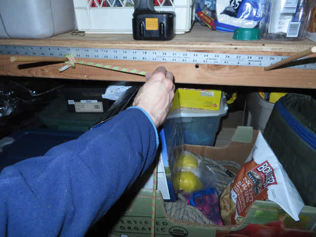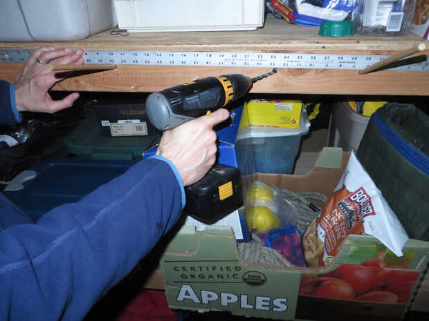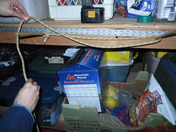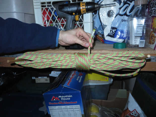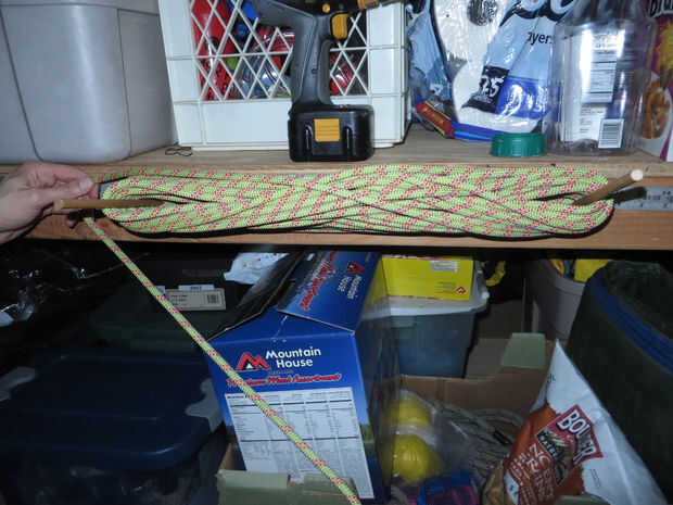 Decidí perforar tres agujeros para mi las clavijas, pero sólo dos clavijas se utilizan a la vez. La distancia entre los más distantes dos es cerca de 20 pulgadas. Vea el criterio en la foto. Luego cortar esa distancia en tercios y poner un agujero más en 1/3 entre los dos. Esto es para que tengas algunas opciones acerca de cómo es grande sus bobinas pueden ser. Utilizar la distancia más larga (20") para subir la cuerda, la distancia más corta de paracord o cordones de extensión largos y la media distancia para longitudes más cortas de la cuerda gruesa.