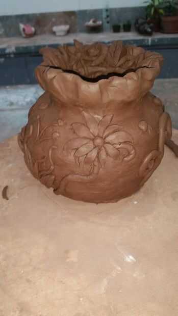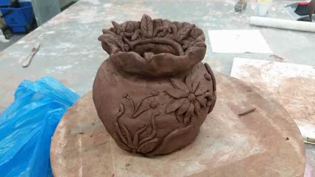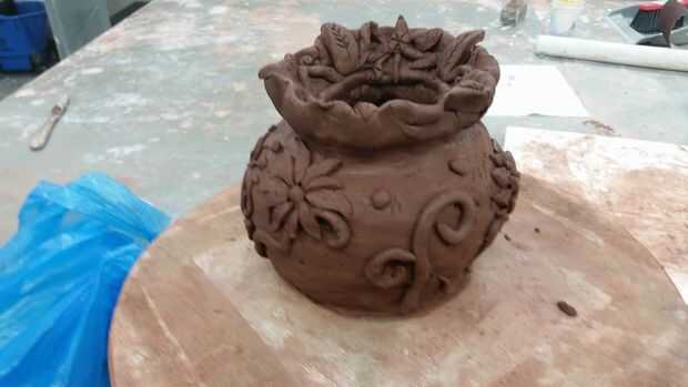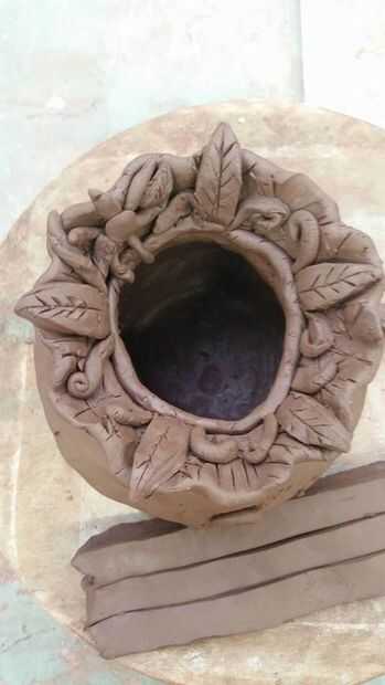 7 para colocar decoraciones, mojar la arcilla, anotar algunas líneas de criss-cross en donde usted quiere colocar pedazos húmedo la pieza de arcilla y coloque en la olla.