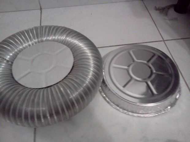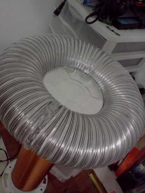 El paso final en la construcción de la bobina de tesla es llenar el hoyo de la toroide con aluminio. Si usted puede obtener una tartera que cabe en la circunferencia interior del toroide, utilizarlo. Si no, tomar una tartera y cortar un círculo que cabe en el toroide. Coloque el toroide en su posición final en la cima de la secundaria y caliente pegamento la brida al tubo.