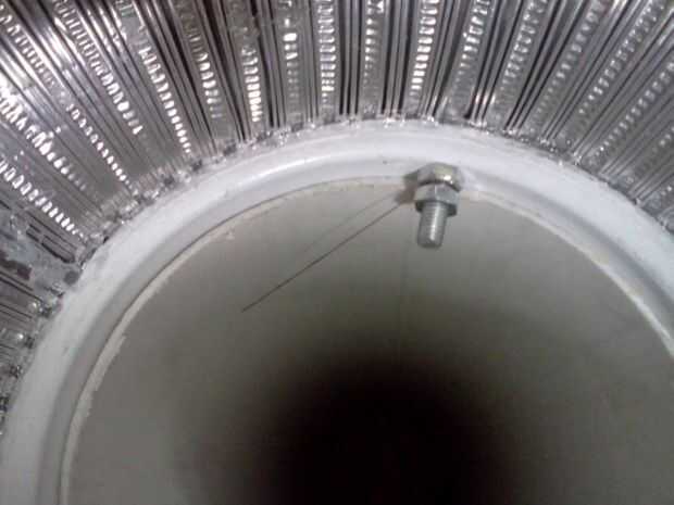 Luego, coloca el toroidal sobre el secundario y había conectado el cable. Algunos de ustedes pueden preguntar: ¿cómo el cable tiene desde el exterior hacia el interior de la tubería? Lo usé fue perforar un agujero pequeño 1/16" a través del tubo. Tener en cuenta que taladrar un agujero limita la longitud de arco máxima de la bobina de Tesla a la separación entre este orificio y la base de la secundaria; cualquier mayor arco interior. Sin embargo, considero que arcos de 17 pulgadas lo suficientemente buenos para mí.