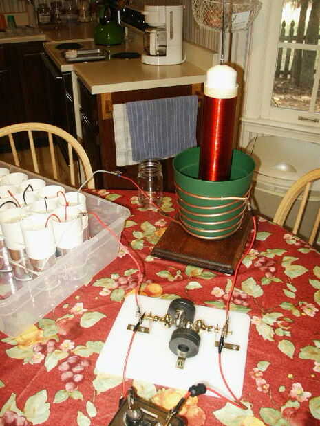 Tuve la suerte de la bobina funcionó la primera vez que lo probé. Estaba francamente sorprendido en cómo fácilmente y bien realizado. Después de unas pruebas, me quemó un capacitor o dos y aprendí que mi primer modelo simple boquete de chispa no era adecuada. Yo he ejecutado desde la bobina con un banco de condensadores de 12 o 14 a mano jarra de Leyden con éxito variable. Yo he también ejecutar con éxito con los casquillos de cerámica pomo realizados en la ex Unión Soviética (comprobación eBay!).
