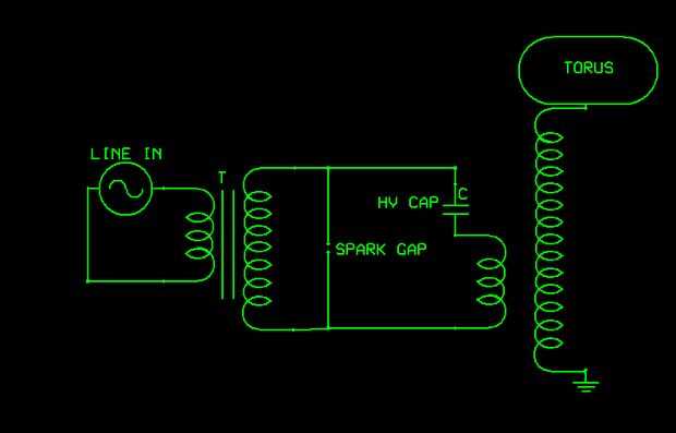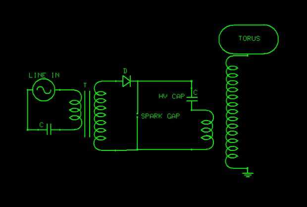 Un MOT saltará el boquete de chispa, pero no irá en un circuito de la bobina. Para dejarlo a construir la tensión he usado un diodo. El diodo no deja que el tapón de descarga. Así que la tensión puede construir y saltar la brecha. (Aún parece fuego cada ciclo AC) No es un multiplicador de voltaje a un rectificador. Un multiplicador mejoraría considerablemente la salida pero no se puede hacer con un microondas.