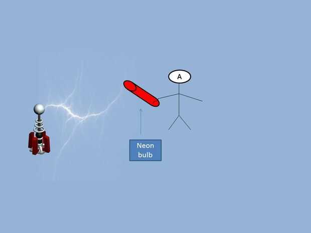 Configurar su experimento según la imagen de arriba. A (conectado a tierra) se mueva hacia atrás lentamente de la bobina y observe la lámpara de neón.