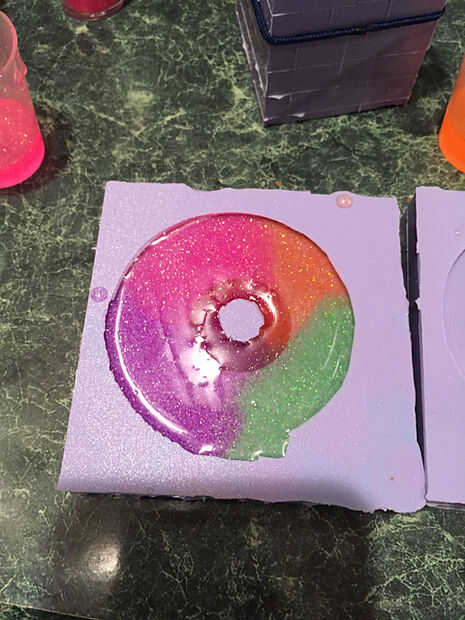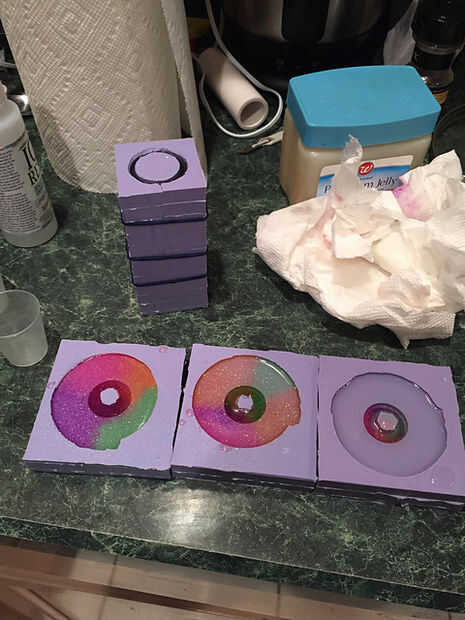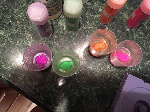 Un método alternativo es usar resina transparente, etiquetas engomadas, deje que las piezas para un rato y luego agregue el brillo en la parte superior del fregadero. El brillo se hunden en y la pieza de color sin oscurecer las pegatinas. Si utilizas etiquetas engomadas Asegúrese de impermeable con pegamento claro así que no se presentan manchas de agua. No hago esto y mis etiquetas engomadas de resultó un poco turbia mirada. Puede que necesite añadir un poco más resina transparente en el brillo dependiendo de qué tan bien se hunde la parte superior.
