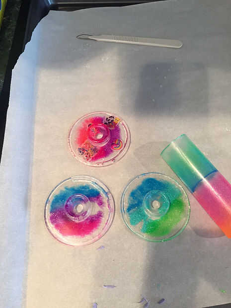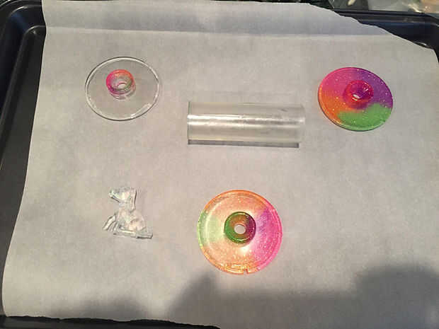 Nota: en vez de hornear se puede definir la resina según las instrucciones del envase dejandolo reposar 12 horas. Sin embargo las piezas seguirán siendo suaves al retirar del molde porque no son lo suficientemente densas como para configurar correctamente. Eventualmente se endurecen pero parece tomar alrededor de una semana. Sólo ponerlos en un plato desechable y ponerlos en algún lugar fuera del camino mientras esperas.