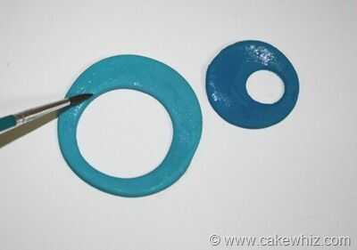 Cepillo de agua en la parte posterior de estos cortes. Ahora, sólo pegar esos círculos de fondant sobre el pastel.
