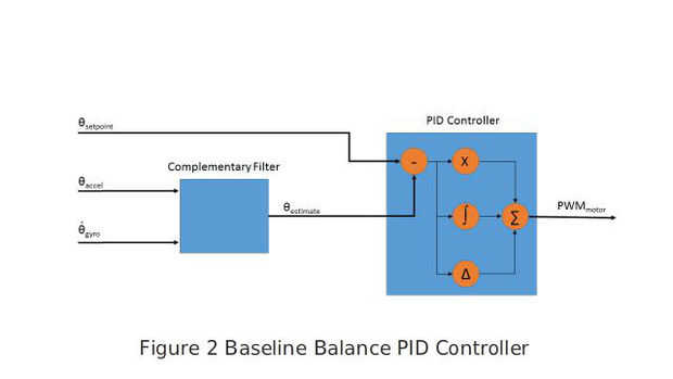 El lazo de control principal para el equilibrio del robot se basa en dos elementos – el filtro de fusión para determinar el ángulo alrededor del robot y un controlador PID con el ángulo estimado para generar la señal de control del motor. La idea detrás de un controlador PID es calcular el error de una señal de control contra un punto de ajuste y luego suma las formas proporcionales, integrales y derivadas de ese error después de que cada uno se han multiplicado por diferentes constantes. El controlador PID muy versátil como elemento de control, con acceso a donde el error ha sido (I), donde está ahora (P) y hacia dónde se dirige (D). Pero estar prevenidos - puede ser una tarea muy difícil para optimizar los multiplicadores de la P, I y D términos. Figura 2 es un diagrama de bloque demostrando la conectividad básica de la estructura y el control y refleja la configuración inicial de este robot.