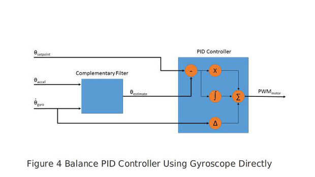 La figura 4 muestra la configuración final, con el giroscopio se alimentan directamente en el término D del controlador PID. Mientras que todas las áreas exploradas tuvieron alguna repercusión sobre el equilibrio de rendimiento, proporciona una indicación de puntuales y mayor fidelidad de la velocidad angular de giroscopio siempre que el cambio en el rendimiento del robot que buscaba.