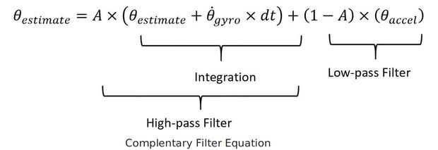 Hay algunos tratamientos muy buenos en la web para los detalles detrás del filtro complementario, sobre que acabo proporciona la ecuación resultante del filtro. En la ecuación, A es una constante que determina las características del filtro. Además, cabe señalar que en los cálculos de ángulo de acelerómetro, estamos tomando ventaja de la aproximación pequeña del ángulo, una realización que para ángulos de menos de ~ 30̊, sin(θ) ≈ θ en radianes. Para nuestro robot, si el ángulo acerca a 30̊, va a caer, por lo que Asunción parece válida. Como resultado podemos saltar la sin(θ) en este cálculo con poco impacto. Por último, la constante de tiempo del filtro complementario también se muestra arriba.