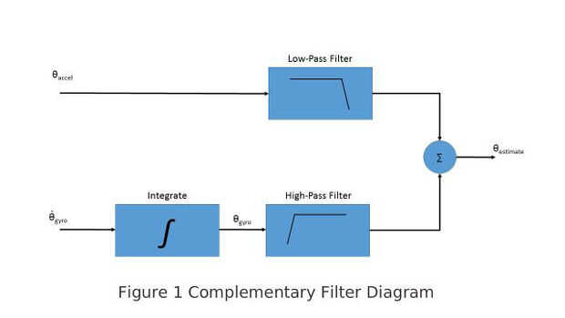 ¿OK, así que tenemos un filtro de la fusión, pero que uno? Existen soluciones muy completas y complejas. El filtro de Kalman es uno de los filtros de fusión más prominentes, pero incluso un ingeniero plenamente no puede equipar a entender lo que está en la caja negra. Para este proyecto utilicé una solución similar, pero menos computacionalmente exigente, el filtro Madgwick. Utilicé este filtro por una razón principal: viene incluido con el Arduino 101! Pero la configuración de la IMU en el caso de equilibrio – sólo un grado de libertad, crea limitaciones que nos permiten utilizar una solución más sencilla, el filtro complementario. El filtro complementario recibe su nombre debido a los factores de multiplicación para cada término añadir hasta 1. Un diagrama de bloques de un filtro complementario se muestra en la figura 1.