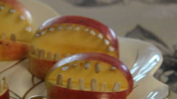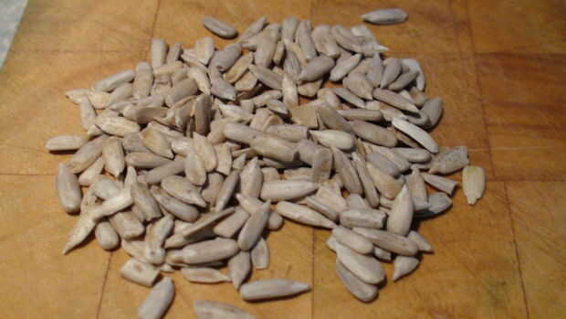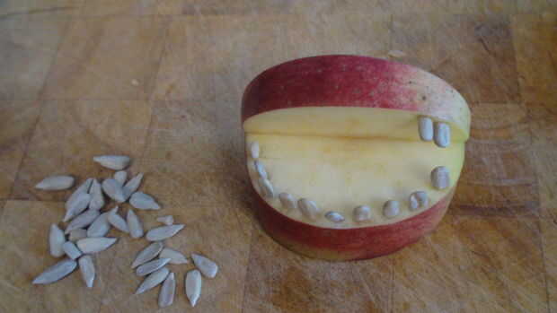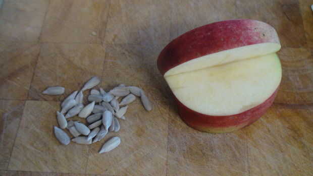 Tiempo para poner algunos granos de girasol en, usted quiere conseguir un kernel y coloque el extremo puntiagudo de la manzana, dejando un poco hacia fuera, usted decide cuántos quiere poner.