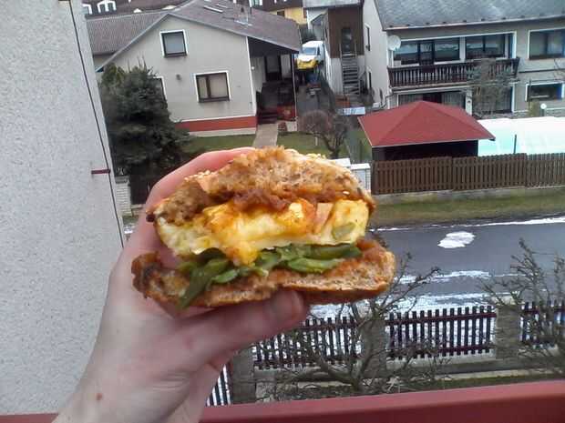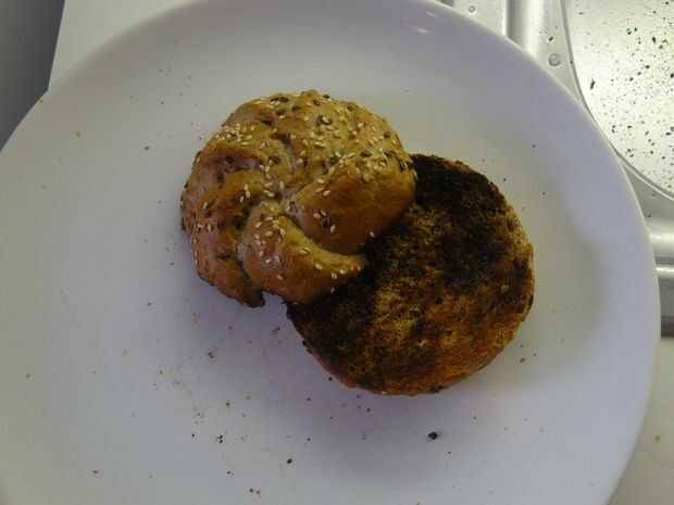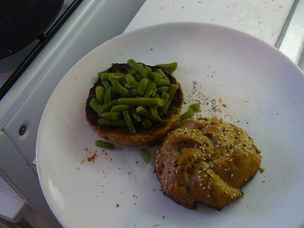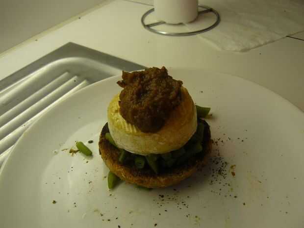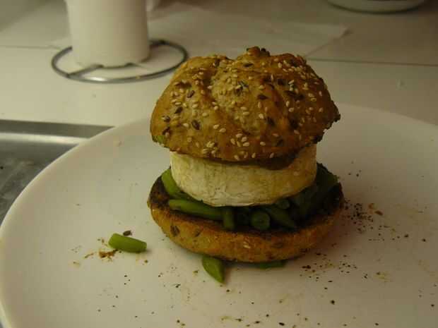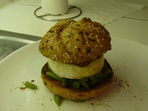 Entonces es fácil - pan inferior, judías verdes, algunas vueltas de molinillo de pimienta negro, cocido al horno camembert, cebolla salsa picante/salsa/goo, los demás ingredientes y finalmente top bun. Ooor...