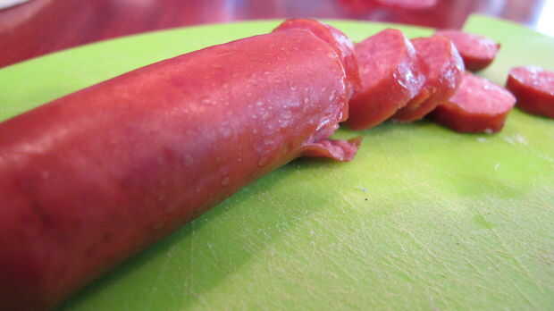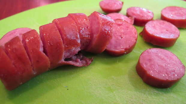 El primer paso es muy auto explanitory: todo lo que necesitas hacer es calentar las salchichas en el microondas durante 25 segundos o hasta comienza a chisporroteo. A continuación, retire con cuidado la salchicha (ya que es caliente!) y cortar en rebanadas de pulgadas de trimestre. Por último, apartar la salchicha cortada.