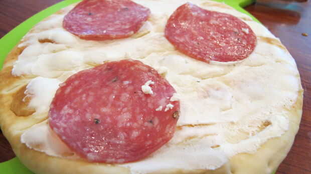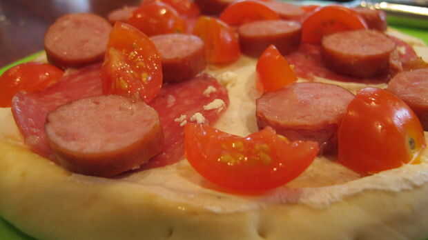 Primero agregue su fino rebanadas salami sobre el pan de pita en una materia un poco organizada (sería bastante correcto?). Añada sus recogidas hojas frescas de albahaca sobre el pan (opcional). Luego esparcir el tomate en rodajas y chorizo en el pan.