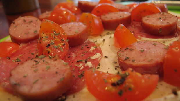 Es el Final, pero paso opcional, a un sabroso aperitivo para añadir las especias. En mi opinión las especias le dan un tiro extra de sabor y realmente engrandecen el sabor del bocadillo.     Espolvorear una pizca de orégano sobre el pan acompañado con algunos de pimienta negra molida. Si usted quiere conseguir realmente creativo que usted puede agregar cualquier especias le gustaría darle la patada que desee.