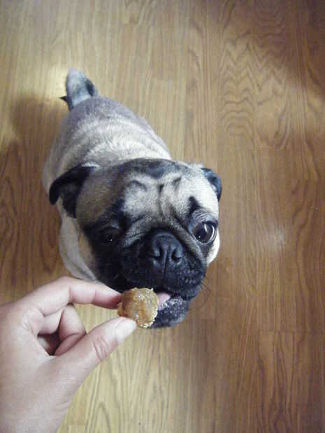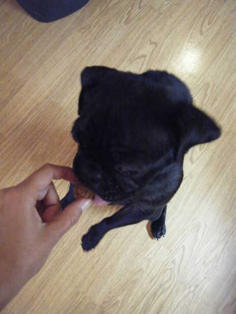Murphy (pug negro) - se puso de pie sobre sus patas traseras para conseguirlo y luego lo embolsó abajo. Volvió a preguntar por segundos y luego en tercios.