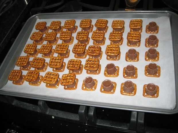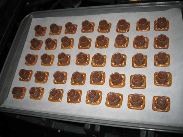 Luego coloque un Rolo encima cada pretzel seguido por otro pretzel para formar un sandwich sabroso.